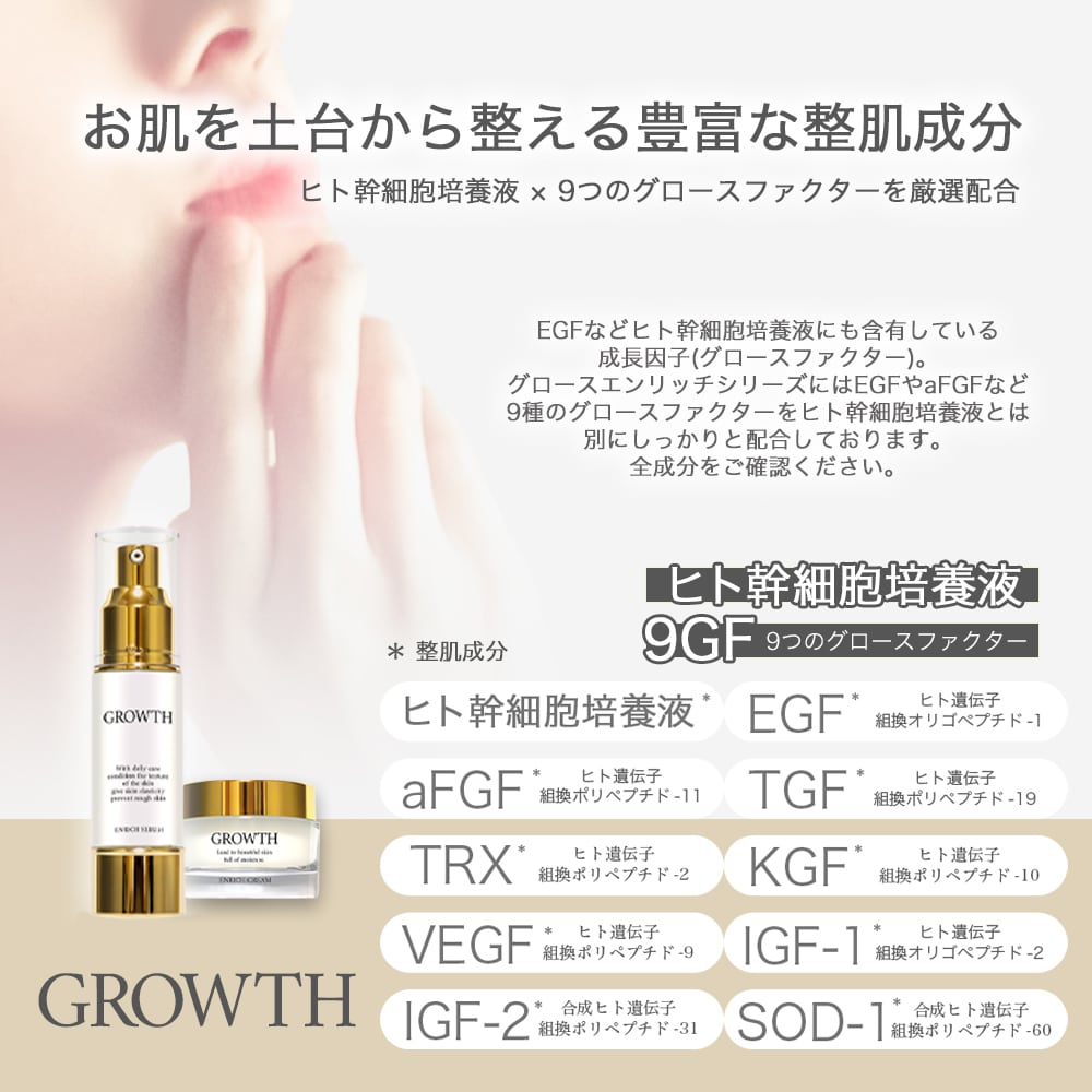 水、BG、スクワラン、ペンチレングレコール、ヒト脂肪細胞順化培養液、(バチルス/ベニコウジ菌)/(ナツメ果実/ダイズ)発酵液、ヒト遺伝子組換オリゴペプチド-1、ヒト遺伝子組換ポリペプチド-11、ヒト遺伝子組換ポリペプチド-10、ヒト遺伝子組換オリゴペプチド-2、ヒト遺伝子組換ポリペプチド-9、合成ヒト遺伝子組換ポリペプチド-60、合成ヒト遺伝子組換ポリペプチド-31、ヒト遺伝子組換ポリペプチド-19、ヒト遺伝子組換ポリペプチド-2、加水分解ヒアルロン酸、アセチルヒアルロン酸Na、加水分解コラーゲン、ナイアシンアミド、PCA-Na、乳酸Na、アルギニン、アスパラギン酸、PCA、グリシン、アラニン、セリン、バリン、プロピン、トレオニン、イソロイシン、ヒスチジン、ラウロイルグルタミン酸ジ(フィトステリル/オクチルドデシル)、ヒアルロン酸Na、セラミドNP、セラミドAP、セラミドEOP、フィトスフィンゴシン、コレステロール、ラウロイルラクチレートNa、水溶性コラーゲン、リン酸Na、レシチン、リゾレシチン、グリセリン、カルボマー、キサンタンガム、EDTA -2Na、エチルヘキシルグリセリン、フェノキシエタノール